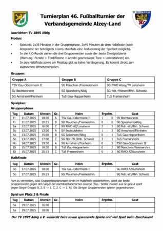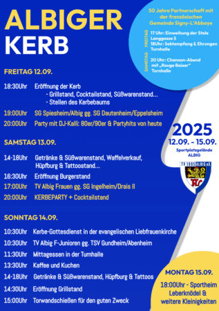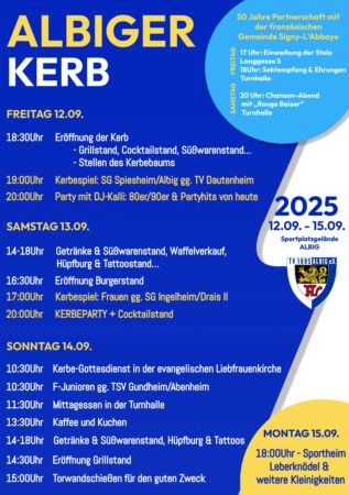 die diesjährige Kerb wurde am Montagabend standesgemäß mit dem Leberknödelessen im Sportheim des TV Albig beendet. Wir möchten uns herzlich bei allen Helfern und Mitwirkenden bedanken, denn ohne euch wäre diese Kerb nicht so geworden, wie wir sie nun gefeiert haben. Ein Verein wie der TV Albig kann nur durch ein lebendiges Miteinander der Mitglieder bestehen und ist darauf angewiesen, unzählige Dienste besetzen zu können – was einen riesigen Aufwand darstellt. Daher ist es an der Zeit, DANKE zu sagen an alle, die an dieser Kerb beteiligt waren! Ohne Euch geht es nicht!